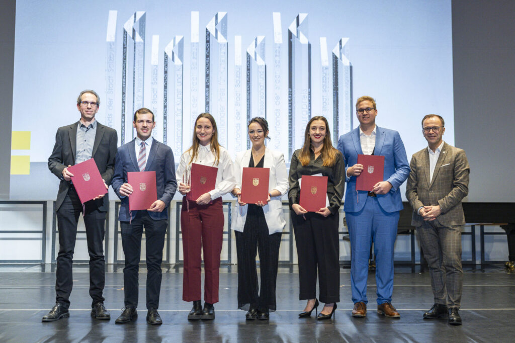 Für ihr Projekt „Zwangslager und Zwangsarbeit im Raum Salzburg in der Zeit des Nationalsozialismus. Strukturen – Schicksale – Erinnerung“ haben die Studierenden und Absolvent:innen des Fachbereichs Geschichte der Universität Salzburg Tobias J. Bidlingmaier, Cassandra Burgstaller, Antonia Hauser, Lena Thurnhausstatter und Markus Zartner sowie Postdoc-Assistent für Zeitgeschichte am Fachbereich Geschichte Johannes Dafinger den Kulturfondspreis 2025 der Landeshauptstadt Salzburg in der Preiskategorie „Förderpreis für Wissenschaft & Forschung“ erhalten. Die feierliche Verleihung des Preises durch Bürgermeister Bernhard Auinger fand am 17. November 2025 in der Universität Mozarteum Salzburg statt.